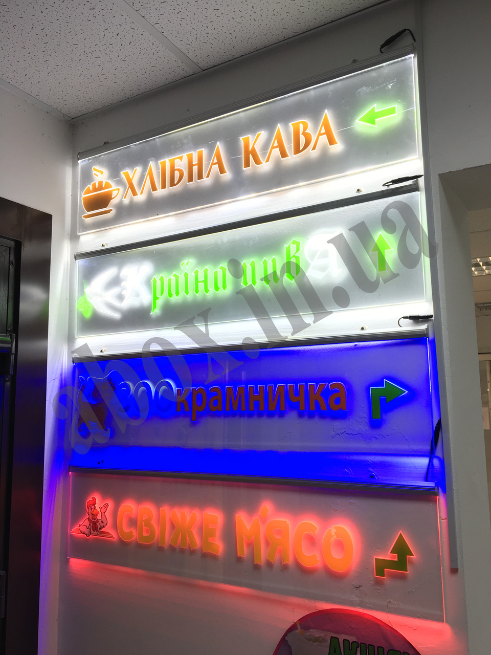 Табличка з підсвічуванням зверху оснащена підвісами. Призначення: компенсувати високі стелі.